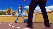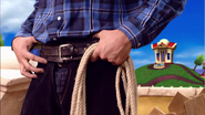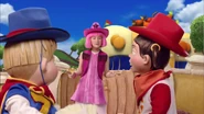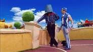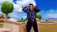 Premise"The LazyTown children are spending the day playing fun games like cowboys and jungle animals, but Robbie arrives in a cowboy costume and a gorilla costume and tries to end their fun." PlotZiggy and Trixie are playing a daredevil game using the slide. Trixie slides down it in a wagon, which doesn’t stop upon decent, causing her to veer uncontrollably towards a gate. Robbie Rotten, who is attempting his “after breakfast nap”, is irritated by her screaming and goes to investigate. Sportacus arrives, opens the gate and stops the cart from moving any further. The kids inform him that they're playing “daredevils” as part of their play day, and when Sportacus tells them to be careful, they tell him that they are going to play something else. Robbie overhears and declares that play day is his “least favorite day ever”, and hopes that they will play something quieter next. As Ziggy and Trixie discuss what they should play next, Sportacus leaves. Stephanie joins the conversation, and the children eventually agree to play cowboys, which they decide should be played noisily. Robbie plots to stop them, choosing a cowboy disguise he dubs "The Rotten Kid". As the kids begin to play, he shows up in full costume spouting Western movie clichés, often incorrectly, to the children’s confusion. He then lassos them and ties them to a post. Their cries for help summon Sportacus, who arrives armed with some ping pong paddles. Sportacus agrees to a duel, complete with Western tropes such as dramatic close ups, music and a tumbleweed before one of them makes their move. This is suddenly interrupted by Robbie scratching his nose, which cuts out the soundtrack score. He insists that it wasn’t his move, and calls out to the sky to “start the music again”. This time, Robbie goes to draw his weapon, but discovers he left it back in his lair. Sportacus calls for an apple to fall from his airship, and then hits it with his paddle to knock off The Rotten Kid’s hat. When Robbie fumbles to retrieve it, Sportacus kicks a bucket in his direction and summons another apple which he uses to knock Robbie into the bucket, ending the cowboy game. Robbie storms off, with the bucket and hat still on his head, and Sportacus frees the children. Everyone decides to change up their play day game again as Sportacus leaves, and Stingy arrives with a soccer ball. This inspires them to play soccer, although Stingy is hesitant to share his ball. Stephanie gets him to agree, on the condition they play by Stingy's rules and change uniform. Meanwhile, Sportacus has his own play day in the airship, practicing football/soccer moves. He then wonders what the kids are playing, and watches below as they sing about (Playtime). Sportacus decides to join in, but the match is cut short when Stingy storms off after his ball gets a grass stain on it. The remaining children choose to play wild animals instead. Robbie overhears and begins to tantrum, before berating himself for acting like a baby, as he is the Master of Disguise. As the children begin their game, with Stephanie as a wild lion, Trixie as a wild tiger and Ziggy as a wild mouse, Robbie disguises himself as a gorilla to scare the children and prevent their game. He initially decides to complete the disguise with a banana, but upon remembering that he hates the fruit, discards the skin on the lair's floor and leaves. At the game's location, he hides behind a wall, intending to arrive by climbing up it and swinging from a vine, but realizes at the last minute that he is afraid of heights. He has an external argument with himself as to whether he should proceed with the plan, eventually agreeing to do so. However, he loses control of the vine, crashing into a tree and landing on a unicycle which he struggles to ride. This successfully scares the children however, and Sportacus arrives using his long scarf as a rope. As he lands, he trips Robbie into a wheelbarrow. When he checks to see if the wild monkey is okay, he accidentally removes the gorilla mask, revealing Robbie, who attempts to justify his actions as "only playing". The children accept this as conformation that Robbie likes play day and they go to play the Bing Bang song as he sulks. In the final scene, Robbie Rotten returns to his den, very tired of the play day, but he slips on the banana peel and falls. The episode ends with jungle music and animal sounds (elephants, birds, monkeys, lions, etc.). TranscriptClick here. Trivia